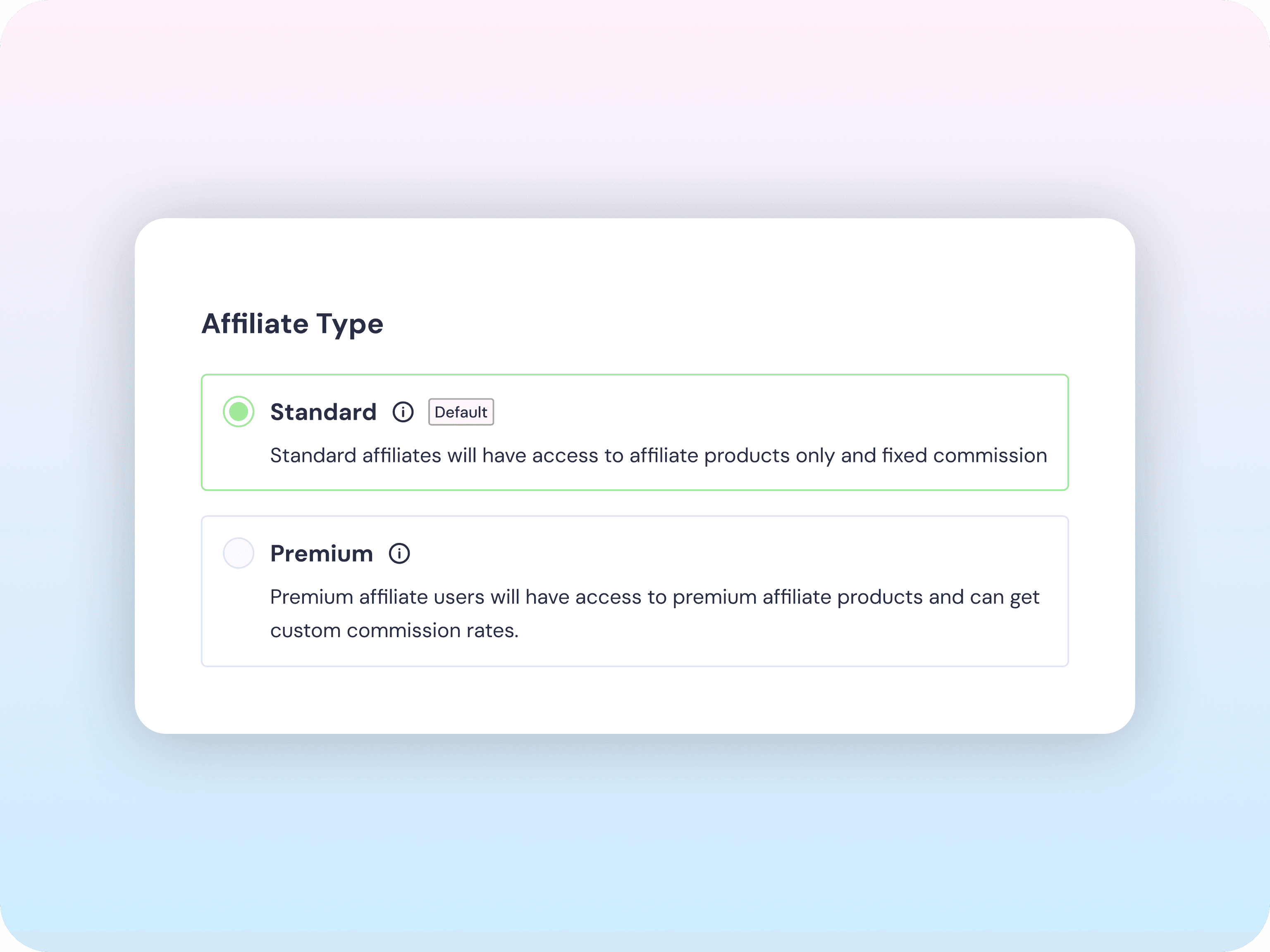Choose between two affiliate tiers, each offering unique benefits. Standard affiliates can promote a wide range of products and earn a fixed commission. Premium affiliates have access to exclusive products and can earn custom commission rates, offering greater earning potential for premium partners.